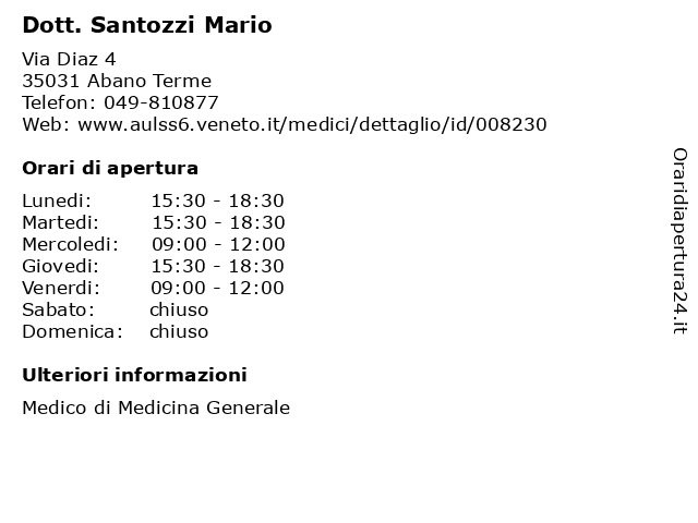 1 Dott.ssa Francesca Fanton (distanza: 0,00 km) Via Diaz 4, 35031 Abano Terme (PD) ambulatori, analisi, cura della persona, cure, dott.ssa, fanton, francesca, medici, medicina, sanità, visite mediche 2 Macelleria f.Lli Mario Sas Di Mario Francesco & c. (distanza: 0,02 km) Via Armando Diaz 8, 35031 Abano Terme francesco, macelleria, macellerie, mario, pescherie, salumerie 3 Sbalchiero Mario (distanza: 0,23 km) Piazza Del Sole e Della Pace 5, 35031 Abano Terme affitto, immob, mario, proprietà, sbalchiero 4 Tramontan Mario (distanza: 0,24 km) Via Armando Diaz 60, 35031 Abano Terme art, comm, dett, giardin, mario, serra, tramontan 5 Ulss 16 Padova - Unità Operativa Materno Infantile • Vaccinazioni (Informazioni e Prenotazioni) (distanza: 1,56 km) Via Galvani 1, 35031 Abano Terme (PD) (informazioni, 16, infantile, materno, operativa, padova, prenotazioni), prevenzione, profilassi, promozione della salute psico-fisica, ulss, unità, vaccinazioni, vaccini 6 Dott.ssa Antonia Prendin (distanza: 2,87 km) Piazza De Claricini 12, 35030 Selvazzano Dentro ambulatori, analisi, antonia, cura della persona, cure, dott.ssa, medici, medicina, prendin, sanità, visite mediche |