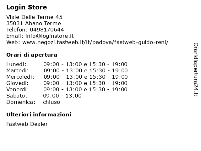 | Lunedi | 09:00-13:00 e 15:30-19:00 |