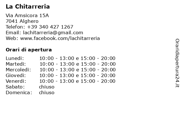 | Venerdi | 10:00-13:00 e 15:00-20:00 |