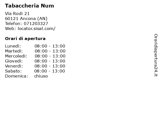 1 Comune di Macerata (Unità Operativa Statistica, Toponomastica, Num. Civica) (distanza: 35,38 km) Viale Trieste 24, 62100 Macerata (unità, civica), comune, di, macerata, num., operativa, statistica, toponomastica, uffici 4 Tabaccheria Edicola Tamburini (distanza: 0,38 km) Viale Della Vittoria 1/B, 60123 Ancona (AN) edicola, scommesse, sisal, tabaccheria, tamburini 5 Tabaccheria Barca (distanza: 0,39 km) Via Montebello 13, 60122 Ancona (AN) barca, fermo, fermopoint, negozio, point, tabaccheria 6 Tabaccheria Linda Giornali Gadget Party (distanza: 0,49 km) Corso Giovanni Amendola 19, 60123 Ancona gadget, giornali, linda, party, tabaccheria |