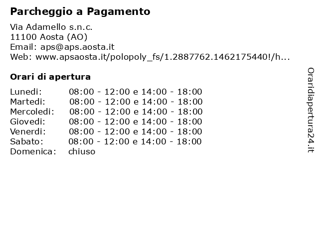 | Sabato | 08:00-12:00 e 14:00-18:00 |