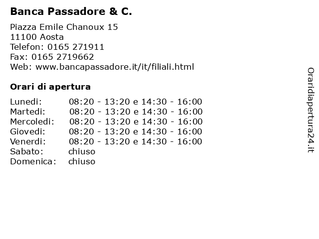 1 Banca Passadore & C. (Bancomat) (distanza: 0,01 km) Piazza Emile Chanoux 15, 11100 Aosta (bancomat), banca, banca passadore, bancomat, c., passadore 2 Banca Monte dei Paschi di Siena (distanza: 0,00 km) Piazza Chanoux Emile 15, 11100 Aosta banca, banche, cassa, credito, dei, di, monte, ordinario, paschi, risparmio, siena, spa 3 Intesa Sanpaolo S.p.A. (distanza: 0,05 km) Via xavier de maistre 8, 11100 Aosta associazione di risparmio e prestito, bancomat, carte di credito, consulente finanziario, intesa, s.p.a., sanpaolo, servizi di investimento 4 Unicredit Spa (distanza: 0,12 km) Avenue Du Conseil Des Commis 19, 11100 Aosta banche, cassa, credito, ordinario, risparmio, spa, unicredit 5 Banca d'Italia (distanza: 0,14 km) Avenue du Conseil des Commis 21, 11100 Aosta banca, conto, d'italia, ramo, soldi 6 Unicredit Spa (distanza: 0,14 km) Avenue Du Conseil Des Commis 17, 11100 Aosta banche, cassa, credito, ordinario, risparmio, spa, unicredit |