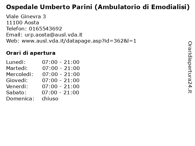 1 Ospedale Umberto Parini (Ambulatori - Piastra) (distanza: 0,00 km) Viale Ginevra 3, 11100 Aosta (ambulatori, medici, ospedale, parini, piastra), salute, umberto 2 Ospedale Umberto Parini (Poliambulatorio di Châtillon) (distanza: 0,00 km) Viale Ginevra 3, 11100 Aosta (poliambulatorio, châtillon), di, medici, ospedale, parini, salute, umberto 3 Ospedale Umberto Parini (Poliambulatorio di Châtillon Ecg + visita cardiologica) (distanza: 0,00 km) Viale Ginevra 3, 11100 Aosta (poliambulatorio, cardiologica), châtillon, di, ecg, medici, ospedale, parini, salute, umberto, visita 4 Ospedale Umberto Parini (Poliambulatorio di Morgex Ecg + visita cardiologica) (distanza: 0,00 km) Viale Ginevra 3, 11100 Aosta (poliambulatorio, cardiologica), di, ecg, medici, morgex, ospedale, parini, salute, umberto, visita 5 Ospedale Umberto Parini (Poliambulatorio di Morgex) (distanza: 0,00 km) Viale Ginevra 3, 11100 Aosta (poliambulatorio, di, medici, morgex), ospedale, parini, salute, umberto 6 Ospedale Umberto Parini (Poliambulatorio di Châtillon Dottor David Pavoncello) (distanza: 0,00 km) Viale Ginevra 3, 11100 Aosta (poliambulatorio, châtillon, david, di, dottor, medici, ospedale, parini, pavoncello), salute, umberto |