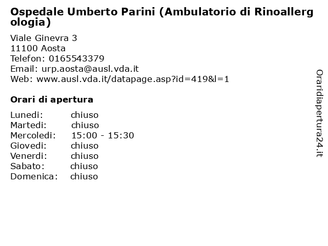 1 Ospedale Umberto Parini (Ambulatori - Piastra) (distanza: 0,00 km) Viale Ginevra 3, 11100 Aosta (ambulatori, medici, ospedale, parini, piastra), salute, umberto 2 Ospedale Umberto Parini (Poliambulatorio di Châtillon) (distanza: 0,00 km) Viale Ginevra 3, 11100 Aosta (poliambulatorio, châtillon), di, medici, ospedale, parini, salute, umberto 3 Ospedale Umberto Parini (Poliambulatorio di Châtillon Ecg + visita cardiologica) (distanza: 0,00 km) Viale Ginevra 3, 11100 Aosta (poliambulatorio, cardiologica), châtillon, di, ecg, medici, ospedale, parini, salute, umberto, visita 4 Ospedale Umberto Parini (Poliambulatorio di Morgex Ecg + visita cardiologica) (distanza: 0,00 km) Viale Ginevra 3, 11100 Aosta (poliambulatorio, cardiologica), di, ecg, medici, morgex, ospedale, parini, salute, umberto, visita 5 Ospedale Umberto Parini (Poliambulatorio di Morgex) (distanza: 0,00 km) Viale Ginevra 3, 11100 Aosta (poliambulatorio, di, medici, morgex), ospedale, parini, salute, umberto 6 Ospedale Umberto Parini (Poliambulatorio di Châtillon Dottor David Pavoncello) (distanza: 0,00 km) Viale Ginevra 3, 11100 Aosta (poliambulatorio, châtillon, david, di, dottor, medici, ospedale, parini, pavoncello), salute, umberto |