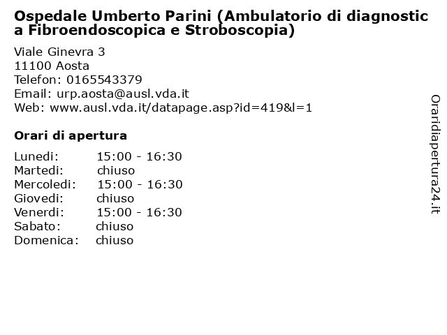 1 Ospedale Umberto Parini (Ambulatori - Piastra) (distanza: 0,00 km) Viale Ginevra 3, 11100 Aosta (ambulatori, medici, ospedale, parini, piastra), salute, umberto 2 Ospedale Umberto Parini (Poliambulatorio di Châtillon) (distanza: 0,00 km) Viale Ginevra 3, 11100 Aosta (poliambulatorio, châtillon), di, medici, ospedale, parini, salute, umberto 3 Ospedale Umberto Parini (Poliambulatorio di Châtillon Ecg + visita cardiologica) (distanza: 0,00 km) Viale Ginevra 3, 11100 Aosta (poliambulatorio, cardiologica), châtillon, di, ecg, medici, ospedale, parini, salute, umberto, visita 4 Ospedale Umberto Parini (Poliambulatorio di Morgex Ecg + visita cardiologica) (distanza: 0,00 km) Viale Ginevra 3, 11100 Aosta (poliambulatorio, cardiologica), di, ecg, medici, morgex, ospedale, parini, salute, umberto, visita 5 Ospedale Umberto Parini (Poliambulatorio di Morgex) (distanza: 0,00 km) Viale Ginevra 3, 11100 Aosta (poliambulatorio, di, medici, morgex), ospedale, parini, salute, umberto 6 Ospedale Umberto Parini (Poliambulatorio di Châtillon Dottor David Pavoncello) (distanza: 0,00 km) Viale Ginevra 3, 11100 Aosta (poliambulatorio, châtillon, david, di, dottor, medici, ospedale, parini, pavoncello), salute, umberto |