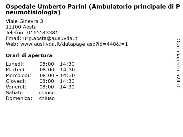 1 Ospedale Umberto Parini (Ambulatori - Piastra) (distanza: 0,00 km) Viale Ginevra 3, 11100 Aosta (ambulatori, medici, ospedale, parini, piastra), salute, umberto 2 Ospedale Umberto Parini (Poliambulatorio di Châtillon) (distanza: 0,00 km) Viale Ginevra 3, 11100 Aosta (poliambulatorio, châtillon), di, medici, ospedale, parini, salute, umberto 3 Ospedale Umberto Parini (Poliambulatorio di Châtillon Ecg + visita cardiologica) (distanza: 0,00 km) Viale Ginevra 3, 11100 Aosta (poliambulatorio, cardiologica), châtillon, di, ecg, medici, ospedale, parini, salute, umberto, visita 4 Ospedale Umberto Parini (Poliambulatorio di Morgex Ecg + visita cardiologica) (distanza: 0,00 km) Viale Ginevra 3, 11100 Aosta (poliambulatorio, cardiologica), di, ecg, medici, morgex, ospedale, parini, salute, umberto, visita 5 Ospedale Umberto Parini (Poliambulatorio di Morgex) (distanza: 0,00 km) Viale Ginevra 3, 11100 Aosta (poliambulatorio, di, medici, morgex), ospedale, parini, salute, umberto 6 Ospedale Umberto Parini (Poliambulatorio di Châtillon Dottor David Pavoncello) (distanza: 0,00 km) Viale Ginevra 3, 11100 Aosta (poliambulatorio, châtillon, david, di, dottor, medici, ospedale, parini, pavoncello), salute, umberto |