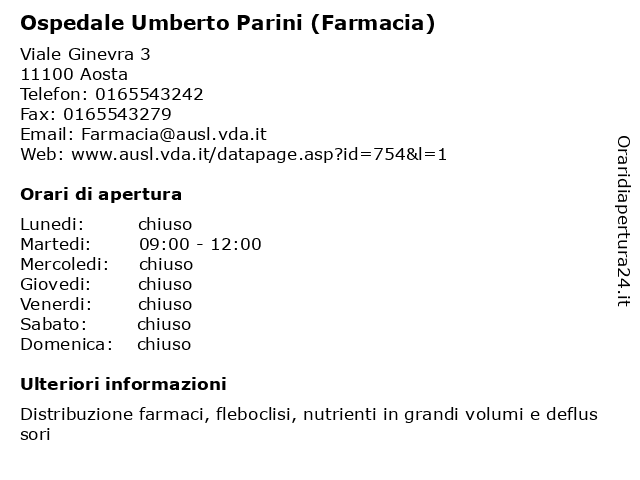 1 Ospedale Umberto Parini (Farmacia) (distanza: 0,00 km) Viale Ginevra 3, 11100 Aosta (farmacia), medici, ospedale, parini, salute, umberto 2 Ospedale Umberto Parini (Farmacia) (distanza: 0,00 km) Viale Ginevra 3, 11100 Aosta (farmacia), medici, ospedale, parini, salute, umberto 3 Ospedale Umberto Parini (Farmacia) (distanza: 0,00 km) Viale Ginevra 3, 11100 Aosta (farmacia), medici, ospedale, parini, salute, umberto 4 Ospedale Umberto Parini (Farmacia) (distanza: 0,00 km) Viale Ginevra 3, 11100 Aosta (farmacia), medici, ospedale, parini, salute, umberto 5 Ospedale Umberto Parini (Ambulatori - Piastra) (distanza: 0,00 km) Viale Ginevra 3, 11100 Aosta (ambulatori, medici, ospedale, parini, piastra), salute, umberto 6 Ospedale Umberto Parini (Poliambulatorio di Châtillon) (distanza: 0,00 km) Viale Ginevra 3, 11100 Aosta (poliambulatorio, châtillon), di, medici, ospedale, parini, salute, umberto |