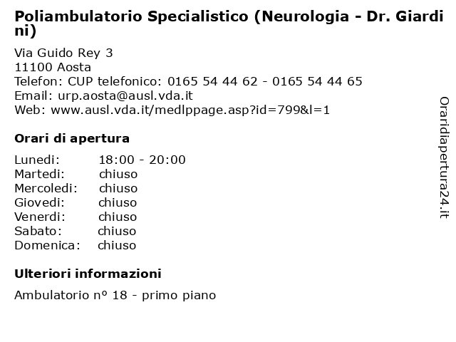 1 Poliambulatorio Specialistico (Neurologia - Dr. Di Giovanni) (distanza: 0,00 km) Via Guido Rey 3, 11100 Aosta (neurologia, ambulatorio, ambulatorio specialistico, di, dr., giovanni), neurologia, poliambulatorio, specialistico, specialità neurologia 2 Poliambulatorio Specialistico (Neurologia - Dr.ssa Cordera) (distanza: 0,00 km) Via Guido Rey 3, 11100 Aosta (neurologia, ambulatorio, ambulatorio specialistico, cordera), dr.ssa, neurologia, poliambulatorio, specialistico, specialità neurologia 3 Poliambulatorio Specialistico (Neurologia - Dr. Bottacchi) (distanza: 0,02 km) Via Guido Rey 3, 11100 Aosta (neurologia, ambulatorio, ambulatorio specialistico, bottacchi), dr., neurologia, poliambulatorio, specialistico, specialità neurologia 4 Ospedale Umberto Parini (Neurologia - Dr. Giardini) (distanza: 0,46 km) Viale Ginevra 3, 11100 Aosta (neurologia, ambulatorio, ambulatorio specialistico, dr., giardini), neurologia, ospedale, parini, specialità neurologia, umberto 5 Ospedale Umberto Parini (Ambulatori Neurologia e Stroke Unit - Diagnostica) (distanza: 0,46 km) Viale Ginevra 3, 11100 Aosta (ambulatori, diagnostica), medici, neurologia, ospedale, parini, salute, stroke, umberto, unit 6 Ospedale Umberto Parini (Neurologia e Stroke Unit Sede Day Hospital) (distanza: 0,46 km) Viale Ginevra 3, 11100 Aosta (neurologia, day, hospital), medici, ospedale, parini, salute, sede, stroke, umberto, unit |