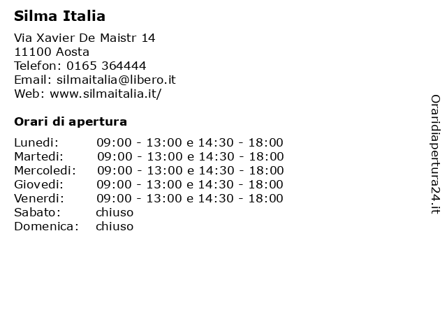 | Venerdi | 09:00-13:00 e 14:30-18:00 |