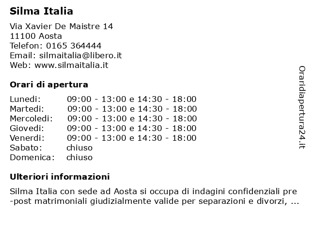 | Lunedi | 09:00-13:00 e 14:30-18:00 |