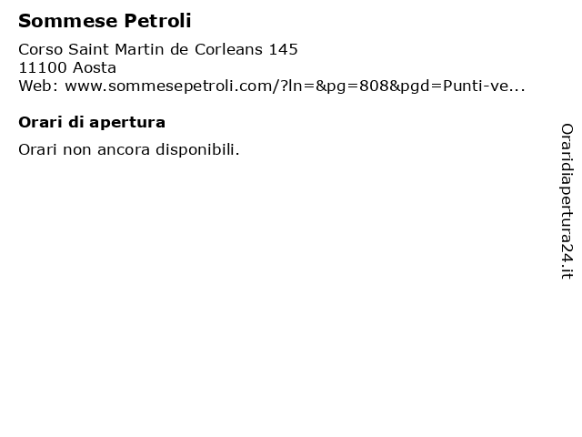 2 Sommese Petroli (distanza: 1,85 km) Via Regione Saraillon s.n.c, 11100 Aosta benzina, petroli, servizi, sommese 3 Sommese Petroli (distanza: 3,87 km) Località Capoluogo 87/A, 11020 Pollein benzina, petroli, servizi, sommese 5 Saint Vincent Petroli Sas (distanza: 26,72 km) Via Della Stazione 25, 11027 Saint-Vincent petroli, saint, sas, vincent 6 |