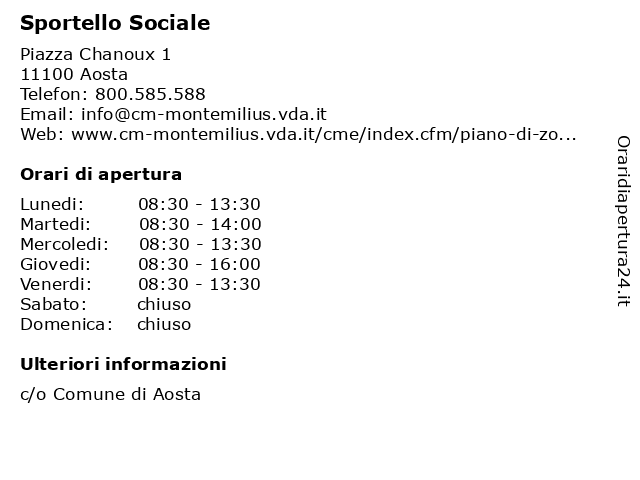 1 Sportello Sociale (distanza: 3,93 km) Frazione Chez Roncoz 29/i, 11010 Gignod assistenza sociale, servizi sociali, servizio sociale, sociale, sportello, sportello sociale 2 Sportello Sociale (distanza: 5,65 km) Località Champeille 8, 11020 Quart assistenza sociale, servizi sociali, servizio sociale, sociale, sportello, sportello sociale 3 Sportello Sociale (distanza: 9,58 km) Piazza Assunzione 18, 11018 Villeneuve assistenza sociale, servizi sociali, servizio sociale, sociale, sportello, sportello sociale 4 Sportello Abilitato all'Attivazione Tessera Sanitaria TS - CNS N°2 (distanza: 0,00 km) Piazza Chanoux 1, 11100 Aosta abilitato, all'attivazione, ambulatorio, assistenza, cns, cure mediche, n°2, sanitaria, sanità, servizi ai cittadini, sportello, tessera, ts 5 Sportello Abilitato all'Attivazione Tessera Sanitaria TS - CNS (distanza: 0,00 km) Piazza Chanoux 1, 11100 Aosta abilitato, all'attivazione, ambulatorio, assistenza, cns, cure mediche, sanitaria, sanità, servizi ai cittadini, sportello, tessera, ts 6 Struttura operativa per Aosta del Servizio Associato dello Sportello Unico (distanza: 0,01 km) Piazza Emile Chanoux 6, 11100 Aosta affisioni, aosta, associato, attività, del, dello, imprese, operativa, per, produttive, pubblicità, servizio, sportello, struttura, unico |