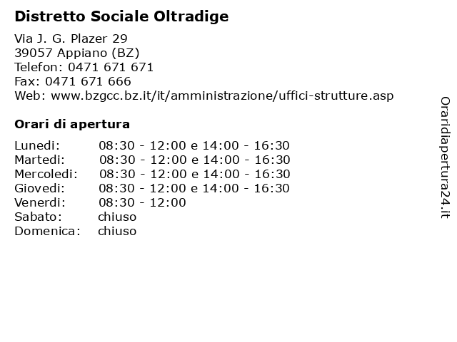 1 Distretto sanitario Oltradige (Servizio amministrativo) (distanza: 0,00 km) Via J. G. Plazer 29, 39057 S.Michele - Appiano sulla strada del Vino (servizio, amministrativo), distretto, informazione, oltradige, sanitario, servizi 2 Distretto sanitario Oltradige (Ambulatorio Infermieristico) (distanza: 0,00 km) Via J. G. Plazer 29, 39057 S.Michele - Appiano sulla strada del Vin (ambulatorio, distretto, infermieristico), informazione, oltradige, sanitario, servizi 3 Distretto sanitario Oltradige (Consultorio materno-infantile) (distanza: 0,00 km) Via J. G. Plazer 29, 39057 S.Michele - Appiano sulla strada del Vino (consultorio, distretto, infantile), informazione, materno, oltradige, sanitario, servizi 4 Distretto sanitario Oltradige (Consultorio ostetrico ) (distanza: 0,00 km) Via J. G. Plazer 29, 39057 S.Michele - Appiano sulla strada del Vino (consultorio, distretto, informazione, oltradige, ostetrico, sanitario, servizi 5 Comunità Comprensoriale Oltradige Bassa Atesina - Segreteria Generale (distanza: 16,11 km) Via Portici 22, 39044 Egna (BZ) atesina, bassa, comprensoriale, comunità, generale, gestione dei servizi sociali, oltradige, realizzazione di opere pubbliche sovracomunali, segreteria, servizi ai cittadini, servizi nel settore ambientale 6 Comunità Comprensoriale Oltradige Bassa Atesina - Servizio Finanziario (distanza: 16,11 km) Via Portici 22, 39044 Egna (BZ) atesina, bassa, comprensoriale, comunità, finanziario, gestione dei servizi sociali, oltradige, realizzazione di opere pubbliche sovracomunali, servizi ai cittadini, servizi nel settore ambientale, servizio |