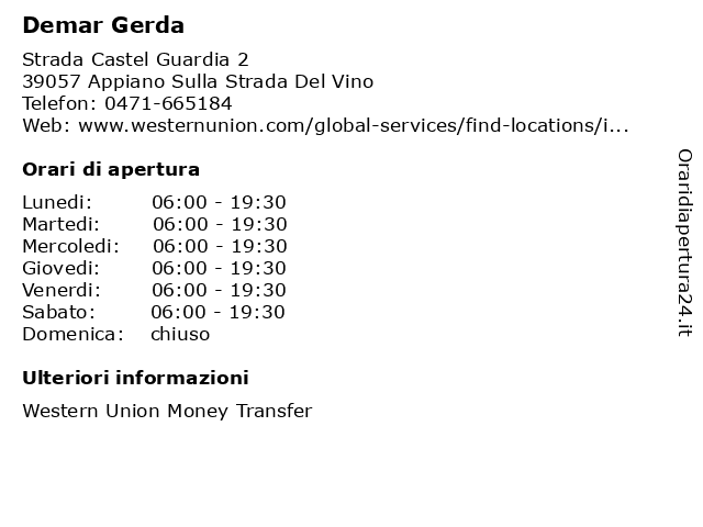 1 Mary Classic Di/Der Bachmann Gerda In Donati (distanza: 7,62 km) Via John Fitzgerald Kennedy 168, 39055 Laives bachmann, classic, comm, der, dett, donati, gerda, mary, scarpe 2 Bar Restaurant Gerda Des Gostner Herbert (distanza: 14,80 km) Via San Quirico 26, 39040 Termeno Sulla Strada Del Vino bar, catering, des, gerda, gostner, herbert, restaurant, ristoranti 3 Weindiele Am Tribusplatz (distanza: 17,61 km) Piazza Tribus j. 4, 39011 Lana am, bottiglierie, der, egger, gerda, getraenke, katharina, superalcolici, tribusplatz, vini, weindiele 4 Schoenthaler Gerda (distanza: 23,41 km) Passeggiata Lungo Passirio 50, 39012 Merano art, comm, dett, gerda, regalo, schoenthaler, souvenir 5 Alpenhof (distanza: 29,10 km) Via Passiria 12, 39010 San Martino In Passiria alpenhof, catering, gerda, kofler, ristoranti 6 Fleischmann Gerda (distanza: 34,82 km) Via Stazione 6, 39021 Laces cartolerie, fleisch, fleischmann, gerda, mann |