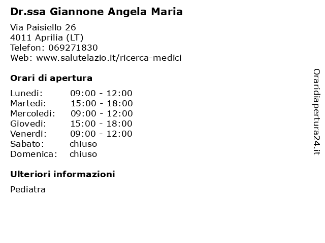 1 Dr.ssa Giannone Angela Maria (distanza: 1,11 km) Via G. di Vittorio 47, 04011 Aprilia (LT) ambulatori, analisi, angela, cura della persona, cure, dr.ssa, giannone, maria, medici, medicina, sanità, visite mediche 2 Pizza e Sfizi Di Leggi Angela (distanza: 0,83 km) Via Villini 7, 04011 Aprilia angela, catering, leggi, pizza, ristoranti, sfizi 3 Tessuti e Confezioni Di Storsillo Angela (distanza: 0,88 km) Via Alighieri 1, 04011 Aprilia angela, confezioni, creazioni, mercerie, storsillo, tessuti 4 Monsue' Gelati Esagerati Di Sposato Angela (distanza: 0,89 km) Via Dei Lauri 126, 04011 Aprilia angela, catering, esagerati, gelati, monsue, ristoranti, sposato 5 Casa Di Riposo Associazione Angela (distanza: 7,34 km) Via Fossignano 61, 04011 Aprilia angela, anziani, assistenza, associazione, base, casa, di, orario, residenza, riposo 6 |