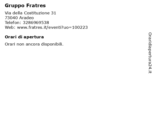 1 Gruppo Fratres (distanza: 2,08 km) Piazza San Paolo 17, 73050 Seclì associazione, donazione, fratres, gruppo 2 Gruppo Fratres (distanza: 2,71 km) Via Dante 1/A, 73040 Neviano associazione, donazione, fratres, gruppo 3 Gruppo Fratres (distanza: 5,46 km) Via Giovanni XXIII snc, 73013 Galatina associazione, donazione, fratres, gruppo 4 Gruppo Fratres (distanza: 6,19 km) Via Rimembranza 25, 73010 Sogliano Cavour associazione, donazione, fratres, gruppo 5 Gruppo Fratres (distanza: 11,37 km) Via Piave 8, 73022 Corigliano d'Otranto associazione, donazione, fratres, gruppo 6 Gruppo Fratres (distanza: 14,71 km) Via Asilo Nido 7, 73020 Castrignano de' Greci associazione, donazione, fratres, gruppo |