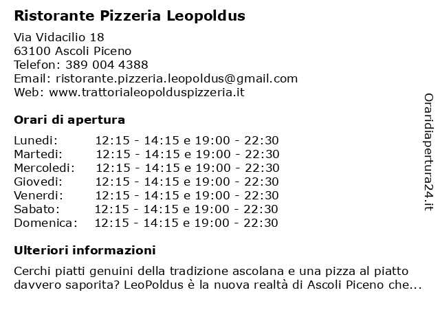 1 Ristorante Leopoldus (distanza: 0,01 km) Via Vidacilio 18, 63100 Ascoli Piceno bere, cibo, leopoldus, mangiare, ristorante, ristorazione |