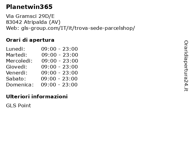 1 Planetwin365 (distanza: 4,35 km) Via Morelli e Silvati 10, 83100 Avellino bar, birrerie, boy, paninoteche, planetwin365, play 3 Planetwin365 (distanza: 6,91 km) Via Terminio 3, 83028 Serino (AV) gls, negozio, planetwin365, shop, spedizione 6 |
