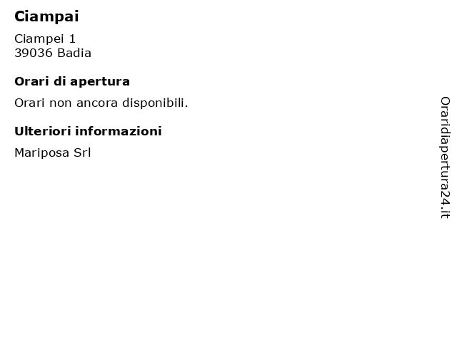2 Ciampai (distanza: 9,11 km) Strada Boscdaplan 71, 39036 Badia bar, birrerie, ciampai, egitz, klaus, paninoteche, von 3 Ciampai Sas Di Norbert Valentini & c. (distanza: 9,87 km) Strada Colz 133, 39036 Badia catering, ciampai, norbert, ristoranti, valentini |