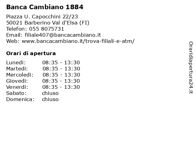 1 Banca Cambiano 1884 (distanza: 4,60 km) Piazza Brandi 36, 50021 Certaldo (FI) 1884, banca, cambiano, conto corrente, cooperativo, credito, finanziamenti, mutuo, prestiti, risparmio 2 Banca Cambiano 1884 (distanza: 4,83 km) Via A. Gramsci 28, 50020 Tavarnelle Val di Pesa (FI) 1884, banca, cambiano, cooperativo, credito, finanziare 3 Banca Cambiano 1884 (distanza: 8,24 km) Largo Campidoglio 26, 53036 Poggibonsi (SI) 1884, banca, cambiano, conto corrente, cooperativo, credito, finanziamenti, mutuo, prestiti, risparmio 4 Banca Cambiano 1884 (distanza: 10,77 km) Via Giacomo Matteotti 29, 50052 Certaldo (FI) 1884, banca, cambiano, cooperativo, credito, finanziare 5 Banca Cambiano 1884 (distanza: 12,17 km) Via delle Mura 10, 53011 Castellina in Chianti (SI) 1884, banca, cambiano, conto corrente, cooperativo, credito, finanziamenti, mutuo, prestiti, risparmio 6 Banca Cambiano 1884 (distanza: 12,71 km) Piazza Santa Croce 8, 50022 Greve in Chianti 1884, attività bancarie, banca, cambiano, cooperativo, credito, denaro, pacchi, trasferimenti, vaglia postali |