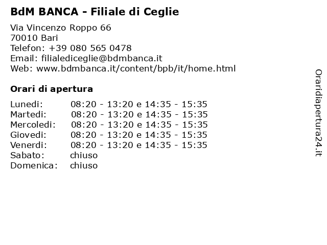 1 BdM BANCA - Filiale di Bari 10 - Papa Giovanni (distanza: 4,56 km) Viale Papa Giovanni XXIII 131, 70124 Bari 10, banca, bari, bdm, filiale, giovanni, papa 2 BdM BANCA - Filiale di Triggiano (distanza: 4,56 km) Corso Vittorio Emanuele 37, 70019 Triggiano banca, bdm, filiale, triggiano 3 BdM BANCA - Filiale di Capurso (distanza: 4,64 km) Via Bari 3, 70010 Capurso banca, bdm, capurso, filiale 4 BdM BANCA - Filiale di Bari 7 - Carrassi (distanza: 5,14 km) Via Luigi Galvani 60, 70125 Bari banca, bari, bdm, carrassi, filiale 5 BdM Banca (distanza: 5,27 km) Via Lembo 36 C/H, 70124 Bari (BA) banca, bdm, conto corrente, mutuo, prelievi, prestiti, versamenti 6 BdM BANCA - Filiale di Bari 8 - Industriale (distanza: 6,09 km) Stradella Privata Palumbo 4, 70123 Bari banca, bari, bdm, filiale, industriale |