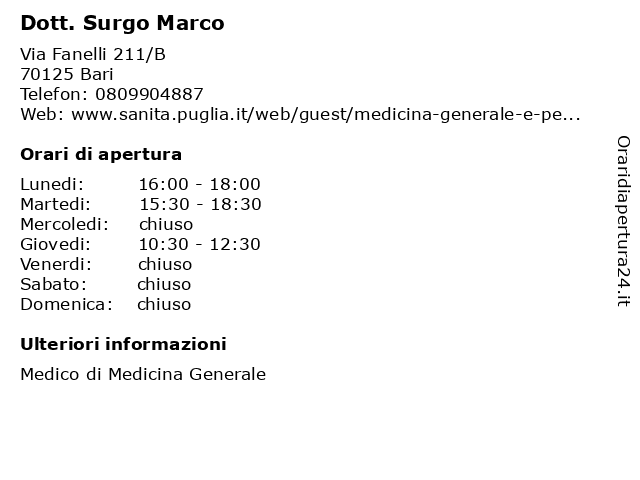 1 Studio Surgo (distanza: 55,53 km) Via Milano 30, 76121 Barletta (BT) associazione, comercialisti, studio, surgo 2 Dott. Calabrese Nicola (distanza: 0,00 km) Via Fanelli 211/B, 70125 Bari ambulatori, analisi, calabrese, cura della persona, cure, dott., medici, medicina, nicola, sanità, visite mediche 3 Dott. De Fini Giuseppe (distanza: 0,00 km) Via Fanelli 211/B, 70125 Bari ambulatori, analisi, cura della persona, cure, de, dott., fini, giuseppe, medici, medicina, sanità, visite mediche 4 Dott.ssa Giumbo Annalisa (distanza: 0,00 km) Via Fanelli 211/B, 70125 Bari ambulatori, analisi, annalisa, cura della persona, cure, dott.ssa, giumbo, medici, medicina, sanità, visite mediche 5 Dott.ssa Ammirabile Antonella (distanza: 0,06 km) Via Fanelli 215, 70125 Bari ambulatori medici base puglia, ammirabile, antonella, dott.ssa, medici di base puglia 6 Dott. Gatti Emanuele (distanza: 0,09 km) Via Giuseppe Fanelli 215 int. 12, 70125 Bari dott., dottor, emanuele, gatti, medici di famiglia bari, medici di medicina generale bari |