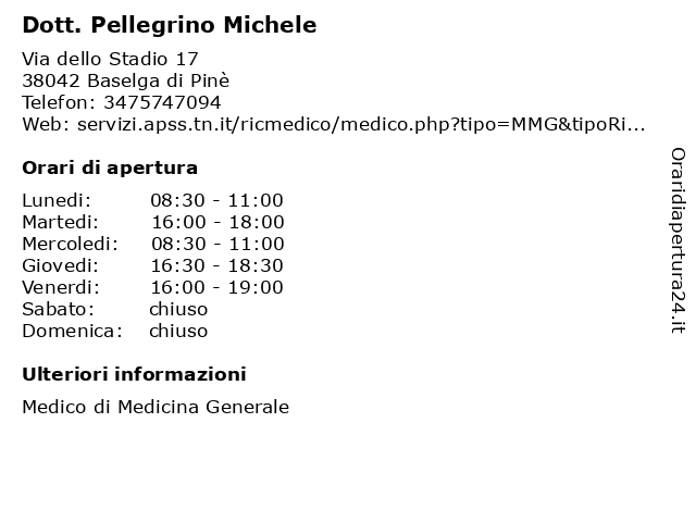 1 Dott. Pellegrino Michele (distanza: 0,68 km) Via del 26 Maggio 10, 38042 Baselga di Pinè dott., generale, medicina, medico, michele, pediatra, pellegrino, pellgrino 2 Dott. Pellegrino Michele (distanza: 5,59 km) Via Verdi 35, 38043 Bedollo (dr., ambulatorio, ambulatorio comunale, cura, dott., dottore, dottoressa, medico, michele, pazienti, pellegrino, pellegrino), visite 3 Dott. Pellegrino Michele (distanza: 6,65 km) Via Vito Bellini 19, 38057 Pergine Valsugana (dr., ambulatorio, ambulatorio comunale, cura, dott., dottore, dottoressa, medico, michele, pazienti, pellegrino, pellegrino), visite 4 Ambulatorio Medico (Dr. Pellegrino) (distanza: 0,63 km) Via del 26 Maggio 10, 38042 Baselga di Pinè (dr., ambulatorio, ambulatorio comunale, cura, dottore, dottoressa, medico, pazienti, pellegrino), visite 5 Segheria Zanoner Pellegrino S.n.c. di Zanoner Giuseppe & C. (distanza: 41,19 km) Strada della comunita de fiem 11, 38035 Moena c., di, giuseppe, pellegrino, s.n.c., segheria, zanoner 6 Agritur Malga San Pellegrino (distanza: 49,85 km) Passo San Pellegrino s.n.c, 38035 Moena agritur, agriturismo, cibi biologici, cucina, malga, natura, pellegrino, san |