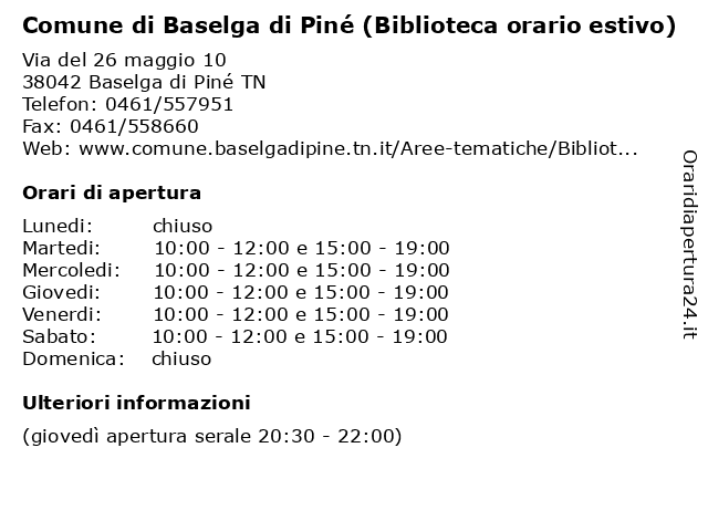 Tag di ricerca per Comune di Baselga di Piné (Biblioteca orario estivo):di, comune, orario, estivo), biblioteche, musei, baselga, pinè, (biblioteca, centri culturali |