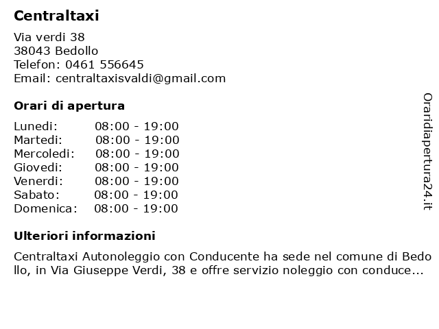 1 2 BluTaxi Valsugana NCC (distanza: 12,48 km) Via Terra Rossa 4, 38123 Trento blutaxi, ncc, servizi, taxi, valsugana 4 NCC Nicolussi Paolaz Alessandra (distanza: 17,18 km) Via Trento 1, 38123 Trento alessandra, ncc, nicolussi, paolaz, servizi, taxi 6 Taxi Noleggio con Conducente Todeschi (distanza: 26,60 km) Via strada vecchia 2/b, 39051 Bronzolo aeroporto, agenzia di noleggio auto, con, conducente, noleggio, taxi, todeschi |