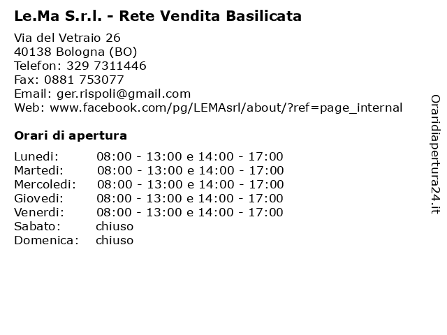 | Lunedi | 08:00-13:00 e 14:00-17:00 |