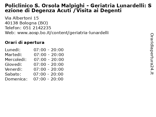 1 Policlinico S. Orsola Malpighi - Oncologia Medica Ardizzoni: Visita ai Degenti (distanza: 0,00 km) Via Albertoni 15, 40138 Bologna ai, ambulatorio, ardizzoni, assistenza, cure mediche, degenti, malpighi, medica, oncologia, orsola, policlinico, s., sanità, servizi ai cittadini, visita 2 Policlinico S. Orsola Malpighi - Medicina Interna Lenzi: Visita ai Degenti (distanza: 0,00 km) Via Albertoni 15, 40138 Bologna ai, ambulatorio, assistenza, cure mediche, degenti, interna, lenzi, malpighi, medicina, orsola, policlinico, s., sanità, servizi ai cittadini, visita 3 Policlinico S. Orsola Malpighi - Ortopedia e Traumatologia Laus: Visite ai Degenti (distanza: 0,00 km) Via Albertoni 15, 40138 Bologna ai, ambulatorio, assistenza, cure mediche, degenti, laus, malpighi, orsola, ortopedia, policlinico, s., sanità, servizi ai cittadini, traumatologia, visite 4 Policlinico S. Orsola Malpighi - Cardiochirurgia Di Bartolomeo: Visite ai Degenti (distanza: 0,00 km) Via Albertoni 15, 40138 Bologna ai, ambulatorio, assistenza, bartolomeo, cardiochirurgia, cure mediche, degenti, di, malpighi, orsola, policlinico, s., sanità, servizi ai cittadini, visite 5 Policlinico S. Orsola Malpighi - Cardiologia Rapezzi: Day hospital ODS osservazione breve / Visita ai Degenti (distanza: 0,00 km) Via Albertoni 15, 40138 Bologna ai, ambulatorio, assistenza, breve, cardiologia, cure mediche, day, degenti, hospital, malpighi, ods, orsola, osservazione, policlinico, rapezzi, s., sanità, servizi ai cittadini, visita 6 Policlinico S. Orsola Malpighi - Cardiologia Rapezzi: Reparto di degenza donne / Visita ai Degenti (distanza: 0,00 km) Via Albertoni 15, 40138 Bologna ai, ambulatorio, assistenza, cardiologia, cure mediche, degenti, degenza, di, donne, malpighi, orsola, policlinico, rapezzi, reparto, s., sanità, servizi ai cittadini, visita |