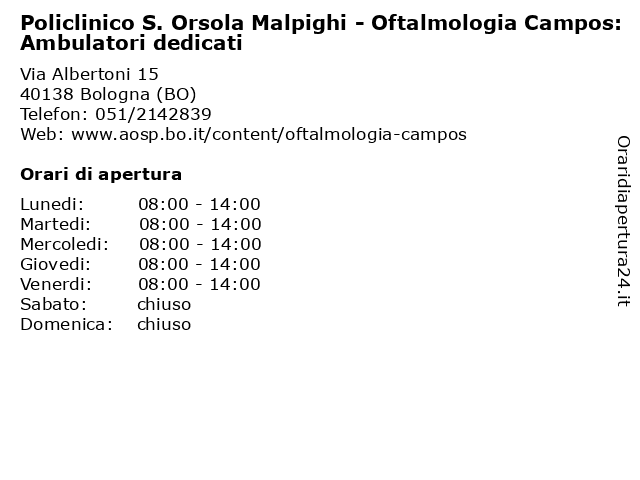 Tag di ricerca per Policlinico S. Orsola Malpighi - Oftalmologia Campos: Ambulatori dedicati:s., sanità, assistenza, ambulatori, ambulatorio, malpighi, orsola, policlinico, oftalmologia, campos, cure mediche, servizi ai cittadini, dedicati |