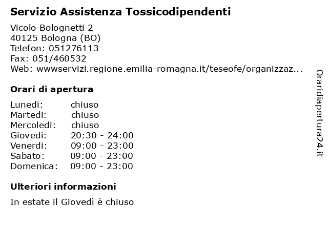 1 Servizio Assistenza Tossicodipendenti (distanza: 3,74 km) Via Rodolfo Mondolfo 8, 40139 Bologna (BO) aiuto, aiuto ai cittadini, assistenza, associazione, informazione, servizio, tossicodipendenti, tutela ai cittadini, volontariato 2 Servizio Assistenza Tossicodipendenti (distanza: 3,89 km) Via Mondolfo Rodolfo 8, 40139 Bologna assistenza, servizio, tossicodipendenti 3 Poliambulatorio Privato Accreditato Forni (distanza: 0,07 km) Via San Vitale 57, 40125 Bologna accreditato, agevolazioni, aiuto, analisi, assistenza, benessere, cliniche, convenzioni, documenti, ecografia, forni, poliambulatorio, prelievi, premi, privato, regolamenti, riabilitazione, risonanza, sanitario, soccorso 4 Poliambulatorio Privato Accreditato Forni (distanza: 0,07 km) Via San Vitale 57, 40125 Bologna accreditato, agevolazioni, aiuto, analisi, assistenza, benessere, cliniche, convenzioni, documenti, ecografia, forni, poliambulatorio, prelievi, premi, privato, regolamenti, riabilitazione, risonanza, sanitario, soccorso 5 Poliambulatorio Privato Accreditato Forni (distanza: 0,07 km) Via San Vitale 57, 40125 Bologna accreditato, agevolazioni, aiuto, analisi, assistenza, benessere, cliniche, convenzioni, documenti, ecografia, forni, poliambulatorio, prelievi, premi, privato, regolamenti, riabilitazione, risonanza, sanitario, soccorso 6 Uildm - Unione Italiana Lotta alla Distrofia Muscolare (distanza: 0,15 km) Via S. Leonardo 24-28, 40125 Bologna alla, assistenza, associazione, disabilitŕ, distrofia, invalidi, italiana, lotta, muscolare, riabilitazione, servizi sociali, tutela, uildm, unione |