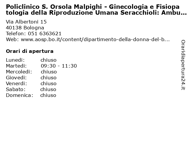 1 Policlinico S. Orsola Malpighi - Ginecologia e Fisiopatologia della Riproduzione Umana Seracchioli: Ricovero programmato (distanza: 0,00 km) Via Albertoni 15, 40138 Bologna ambulatorio, assistenza, cure mediche, della, fisiopatologia, ginecologia, malpighi, orsola, policlinico, programmato, ricovero, riproduzione, s., sanità, seracchioli, servizi ai cittadini, umana 2 Policlinico S. Orsola Malpighi - Ginecologia e Fisiopatologia della Riproduzione Umana Seracchioli: Ambulatorio Colposcopia e chirurgia basso tratto genitale Colposcopia e chirurgia (distanza: 0,00 km) Via Albertoni 15, 40138 Bologna ambulatorio, assistenza, basso, chirurgia, colposcopia, cure mediche, della, fisiopatologia, genitale, ginecologia, malpighi, orsola, policlinico, riproduzione, s., sanità, seracchioli, servizi ai cittadini, tratto, umana 3 Policlinico S. Orsola Malpighi - Ginecologia e Fisiopatologia della Riproduzione Umana Seracchioli: Ambulatorio Ecografia (distanza: 0,00 km) Via Albertoni 15, 40138 Bologna ambulatorio, assistenza, cure mediche, della, ecografia, fisiopatologia, ginecologia, malpighi, orsola, policlinico, riproduzione, s., sanità, seracchioli, servizi ai cittadini, umana 4 Policlinico S. Orsola Malpighi - Ginecologia e Fisiopatologia della Riproduzione Umana Seracchioli: Ambulatorio Visite chirurgiche (distanza: 0,00 km) Via Albertoni 15, 40138 Bologna ambulatorio, assistenza, chirurgiche, cure mediche, della, fisiopatologia, ginecologia, malpighi, orsola, policlinico, riproduzione, s., sanità, seracchioli, servizi ai cittadini, umana, visite 5 Policlinico S. Orsola Malpighi - Ginecologia e Fisiopatologia della Riproduzione Umana Seracchioli: Ambulatorio Uroginecologia (distanza: 0,00 km) Via Albertoni 15, 40138 Bologna ambulatorio, assistenza, cure mediche, della, fisiopatologia, ginecologia, malpighi, orsola, policlinico, riproduzione, s., sanità, seracchioli, servizi ai cittadini, umana, uroginecologia 6 Policlinico S. Orsola Malpighi - Ginecologia e Fisiopatologia della Riproduzione Umana Seracchioli: Ambulatorio Visite endometriosi (distanza: 0,00 km) Via Albertoni 15, 40138 Bologna ambulatorio, assistenza, cure mediche, della, endometriosi, fisiopatologia, ginecologia, malpighi, orsola, policlinico, riproduzione, s., sanità, seracchioli, servizi ai cittadini, umana, visite |