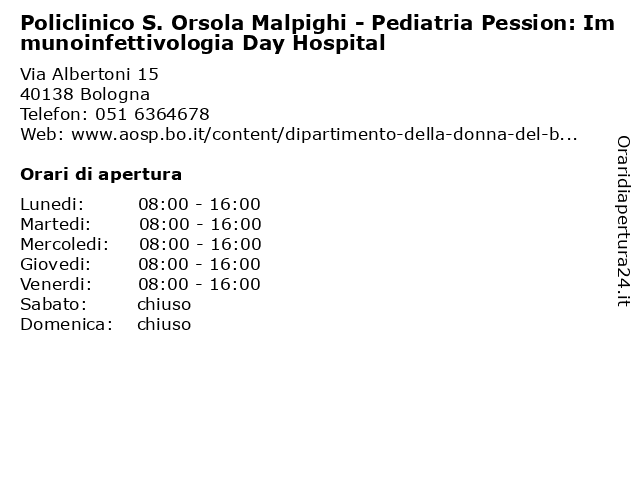 Tag di ricerca per Policlinico S. Orsola Malpighi - Pediatria Pession: Immunoinfettivologia Day Hospital:s., sanità, assistenza, day, ambulatorio, malpighi, orsola, pediatria, policlinico, hospital, cure mediche, servizi ai cittadini, pession, immunoinfettivologia |