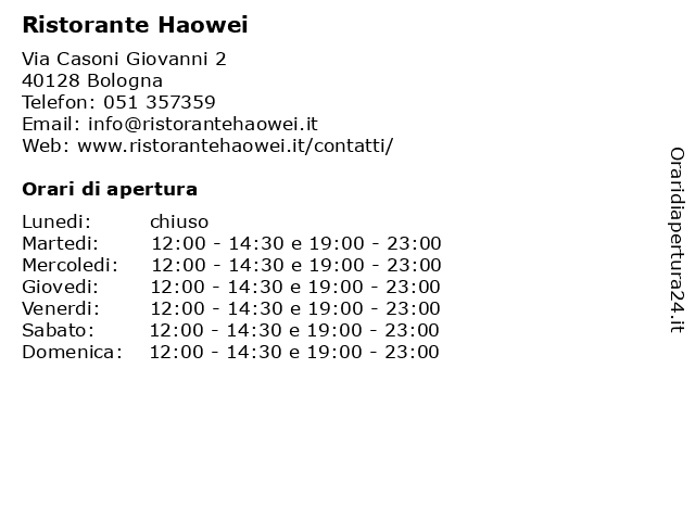 | Martedi | 12:00-14:30 e 19:00-23:00 |