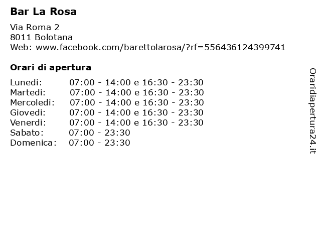 | Lunedi | 07:00-14:00 e 16:30-23:30 |