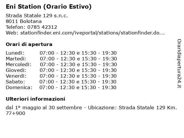 1 Eni Station (Orario Estivo) (distanza: 1,70 km) Strada Statale 129 s.n.c, 08011 Bolotana (orario, eni, estivo), gasolio, station, stazione di benzina 2 ENI STATION (orario estivo) (distanza: 3,11 km) Ss. 129 Macomer SNC, 08011 BOLOTANA (NU) (orario, benzina, blu diesel, carburanti, diesel, energia, eni, estivo), lubrificanti, soccorso, station, stazione, super 3 ENI STATION (orario estivo) (distanza: 10,36 km) Liberta SNC, 08020 OTTANA (NU) (orario, benzina, blu diesel, carburanti, diesel, energia, eni, estivo), lubrificanti, soccorso, station, stazione, super 4 Eni Station (Orario Estivo) (distanza: 15,74 km) Corso Umberto I 255, 08015 Macomer (orario, distributori carburanti, eni, estivo), station, stazioni di servizio eni 5 Eni Station (Orario Estivo) (distanza: 15,95 km) Strada Statale 131 Km 137+620 snc, 08016 Borore (orario, distributore di carburanti, eni, estivo), station, stazione di servizio 6 Eni Station (Orario Estivo) (distanza: 17,21 km) Strada Statale 131 s.n.c., 08016 Borore (orario, distributori carburanti, eni, estivo), station, stazioni di servizio eni |