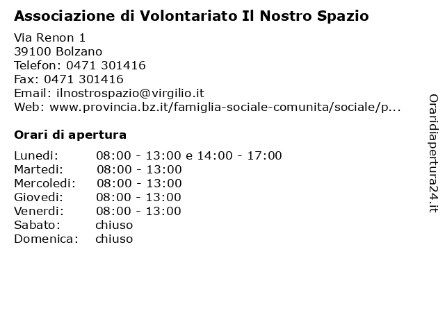 | Lunedi | 08:00-13:00 e 14:00-17:00 |