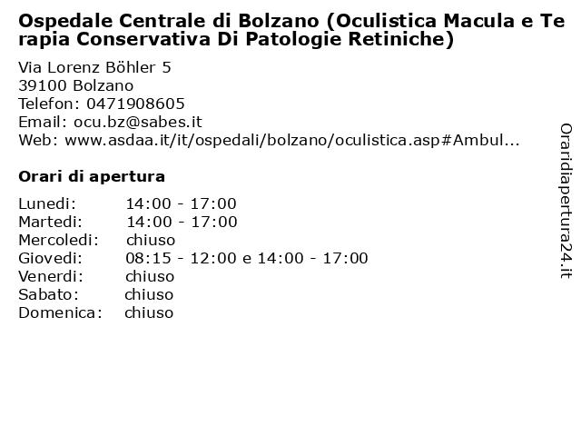 1 Ospedale Centrale di Bolzano (Oculistica FAG per maculopatia) (distanza: 0,00 km) Via Lorenz Böhler 5, 39100 Bolzano (oculistica, bolzano, centrale, di, fag, maculopatia), medici, ospedale, per, salute 2 Ospedale Centrale di Bolzano (Oculistica Strabologico e neurooftalmologico) (distanza: 0,00 km) Via Lorenz Böhler 5, 39100 Bolzano (oculistica, bolzano, centrale, di, medici, neurooftalmologico), ospedale, salute, strabologico 3 Ospedale Centrale di Bolzano (Oculistica Pazienti diabetici trattamento laser) (distanza: 0,00 km) Via Lorenz Böhler 5, 39100 Bolzano (oculistica, bolzano, centrale, di, diabetici, laser), medici, ospedale, pazienti, salute, trattamento 4 Ospedale Centrale di Bolzano (Oculistica Angiografia e fotografia retinica e del segmento anteriore) (distanza: 0,00 km) Via Lorenz Böhler 5, 39100 Bolzano (oculistica, angiografia, anteriore), bolzano, centrale, del, di, fotografia, medici, ospedale, retinica, salute, segmento 5 Ospedale Centrale di Bolzano (Oculistica Visita Ordinaria) (distanza: 0,00 km) Via Lorenz Böhler 5, 39100 Bolzano (oculistica, bolzano, centrale, di, medici, ordinaria), ospedale, salute, visita 6 Ospedale Centrale di Bolzano - Visita ai Degenti: Oculistica (distanza: 0,04 km) Via Lorenz Böhler 5, 39100 Bolzano ai, ambulatorio, assistenza, bolzano, centrale, cure mediche, degenti, di, oculistica, ospedale, sanità, servizi ai cittadini, visita |