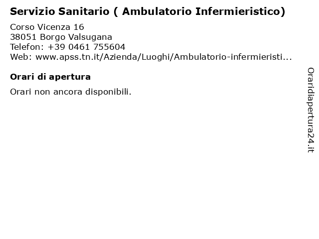 1 Servizio Sanitario ( Ambulatorio Infermieristico) (distanza: 11,47 km) Via Brigata Abruzzi 10/b, 38050 Pieve Tesino ambulato, ambulatorio, ambulatorio infermieristico, assistenza infermieristica, infermiere, infermieristico, infermieristico), pieve, sanitario, servizio, tesino 2 Servizio Sanitario - Ambulatorio Infermieristico (distanza: 0,00 km) viale Vicenza 16, 38051 Borgo ambulato, ambulatorio, ambulatorio infermieristico, assistenza infermieristica, borgo, infermiere, infermieristico, sanitario, servizio, valsugana 3 Servizio Sanitario - Consultorio (distanza: 0,07 km) viale Vicenza 9, 38051 Borgo Valsugana consultorio, consultorio familiare, cure primarie, gravidanza, interruzione volontaria gravidanza, nascita, post parto, prima e dopo nascita, puerperio, sanitario, servizio, spazio giovani 4 Servizio Sanitario - Punto unico di accesso PUA (distanza: 0,07 km) viale Vicenza 9, 38051 Borgo Valsugana accesso, assistenza domiciliare integrata cure palliative, assistenza protesica, bassa, di, malattie cronico-degenerative, neoplastiche in fase avanzata, pua, punto, punto unico cure primarie, sanitario, servizio, servizio cure palliative, tesino, unico, valsugana 5 Distretto Sanitario Est Alta Valsugana (Servizio cassa) (distanza: 16,92 km) Via San Pietro 2, 38057 Pergine Valsugana (servizio, alta, azienda provinciale servizi sanitari distretto est, azienda sanitaria distretto est, cassa), distretto, est, sanitario, valsugana 6 Distretto Sanitario Est Alta Valsugana (Assistenza primaria) (distanza: 16,92 km) Via San Pietro 2, 38057 Pergine Valsugana (assistenza, alta, azienda provinciale servizi sanitari distretto est, azienda sanitaria distretto est, distretto, est, primaria), sanitario, valsugana |