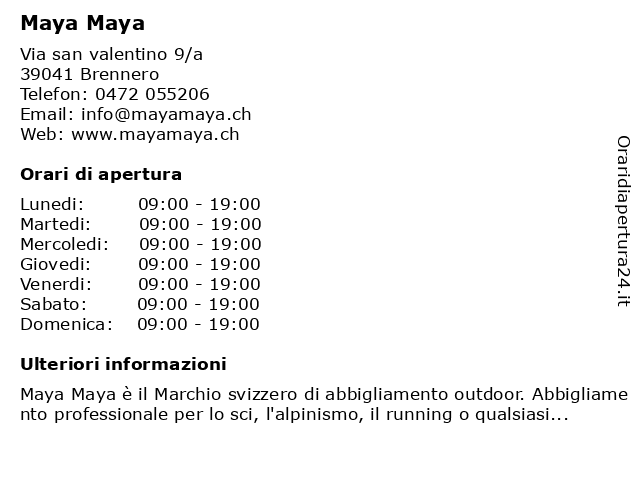 1 Maya Maya (distanza: 0,09 km) Via San Valentino 9/a, 39041 Brennero abbigl, comm, dett, genere, maya, outdoor, passion, swiss 2 Bar Tabacchi Maya (distanza: 45,06 km) Via Fontana 21, 39012 Merano bar, maya, merano, scommesse, sisal, tabacchi 3 Parfuemerie Maya Fashion And More Der Fischnaller Dorothea (distanza: 45,35 km) Via Portici 259, 39012 Merano and, der, dorothea, fashion, fischnaller, maya, more, parfuemerie |