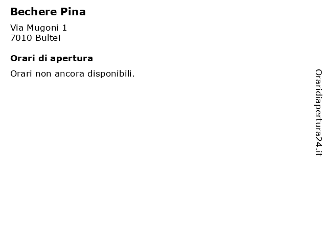 2 Charlie Bar Di Pina Serra (distanza: 42,93 km) Via Santissima Annunziata 73, 08020 Lode' bar, birrerie, charlie, paninoteche, pina, serra 3 MASCIA ROSARIA PINA (distanza: 47,33 km) VIA CAGLIARI 7, 08036 Ortueri abbonamenti, autobus, mascia, pina, rosaria, vendita biglietti 4 Carbone Antioca Pina (distanza: 48,67 km) Via Palmiro Togliatti 1, 08020 Irgoli antioca, carbone, catering, pina, ristoranti 5 Su Montigu Di Chessa Maria Pina (distanza: 49,47 km) Via Azuni 115, 09075 Santu Lussurgiu catering, chessa, maria, montigu, pina, ristoranti, su 6 Dott. Idini Pina (distanza: 51,81 km) Via Monte Grappa 82, 07100 Sassari ambulatorio, assistenza, cure mediche, dott., idini, pina, sanità, servizi ai cittadini |