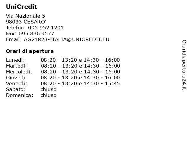 3 Unicredit (ATM) (distanza: 0,00 km) Via Nazionale 5, 98033 Cesarò (atm), (bancomat), agenzie, banche, unicredit 4 Unicredit (ATM) (distanza: 12,03 km) Piazza Martiri d'Ungheria 25/30, 94018 Troina (atm), (bancomat), agenzie, banche, unicredit 5 Unicredit (ATM) (distanza: 12,51 km) Piazza Vincenzo Castiglione 3, 95034 Bronte (atm), (bancomat), agenzie, banche, unicredit 6 Unicredit (distanza: 33,05 km) P.ZA DUOMO 7, 98068 SAN PIERO PATTI assicurazione per la casa, assicurazione per la persona, banca, bancomat, carta prepagata, conto, creditexpress dynamic, finanziamenti, genius first, genius smart, investimenti, mutui, prestiti personali, super genius 2.0, unicredit, unicreditcard click, unicreditcard flexia classic |