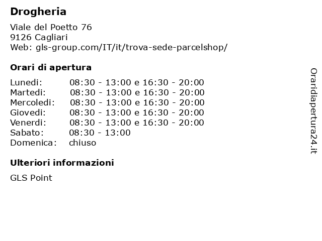 1 Drogheria Mascia (distanza: 3,12 km) Via XX Settembre 29, 09125 Cagliari caffè, drogheria, frutta candita, mascia, spezie, vendita 2 Drogheria Story Di Giorgio Trincas e c. Sas (distanza: 3,88 km) Via Domenico Alberto Azuni 62, 09124 Cagliari catering, drogheria, giorgio, ristoranti, story, trincas 3 In Drogheria Di Mereu Francesca (distanza: 5,94 km) Via Is Mirrionis 148/a b, 09122 Cagliari drogheria, francesca, macellerie, mereu, pescherie, salumerie 4 Drogheria Loi Teresa (distanza: 12,91 km) Via P. Meloni 25, 09028 Sestu club, drogheria, loi, pizzeria. bar, ristorante, teresa 5 Drogheria Loi Teresa (distanza: 12,91 km) Via Meloni 25, 09028 Sestu drogheria, gastronomia, generi alimentari, loi, teresa 6 Romana Market (distanza: 1,06 km) Via Ischia 1, 09126 Cagliari drogheria o negozio di alimentari, market, romana |