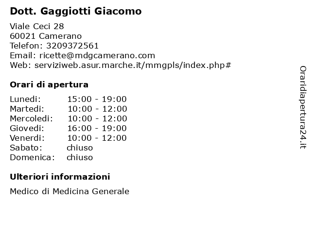1 Ambulatorio medico Dott. Di Giuseppe Giacomo (distanza: 1,96 km) Via Varano 39, 60121 Ancona ambulatorio, di, dott., giacomo, giuseppe, medico, sanità 2 Gaggiotti Immobiliare Srl (distanza: 2,21 km) Via Chiusa 32/a, 60027 Osimo affitto, gaggiotti, immob, immobiliare, propriet 3 Officina Elettrauto Giacomo Sampaolo (distanza: 2,27 km) Via Della Sbrozzola 40, 60021 Camerano autofficina, elettrauto, giacomo, officina, sampaolo 4 Destro Giacomo Silvio (distanza: 3,83 km) Via Garibaldi Giuseppe 11, 60027 Osimo abbigliamento moto, destro, giacomo, silvio 5 Ristorante Da Giacomo (distanza: 4,13 km) Via Adriatica 28, 60022 Castelfidardo cibo, da, giacomo, pizza, pizzeria, ristorante 6 Dott. Di Giuseppe Giacomo (distanza: 4,23 km) Via Varano 39/A, 60131 Ancona ambulatorio, cura, di, dott., dottore, giacomo, giuseppe, medico, studio medico |