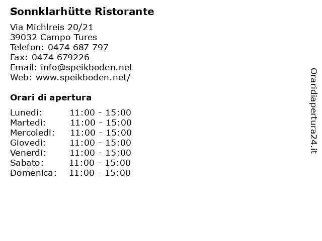 | 1 Sonnklarhütte (distanza: 0,00 km) Via Michlreis 20/21, 39032 Campo Tures bar, bere, mangiare, pizzeria, ristorante, sonnklarhütte, specialità, stuzzicheria 2 Sonnklarhütte Speikboden (distanza: 0,01 km) Via Michelreiser Weg 20, 39032 Campo Tures bar, caffè, dolci, pasticceria, sonnklarhütte, speikboden 3 Sonnklarhütte (Giugno - Ottobre) (distanza: 2,30 km) Speikboden Funivie snc, 39032 Campo Tures (giugno, bar, bere, caffetteria, camere, locale, mangiare, ottobre), ristorante, sonnklarhütte, stuzzicheria 4 Sonnklarhütte Ristorante (Giugno - Ottobre) (distanza: 2,30 km) Speikboden Funivie snc, 39032 Campo Tures (giugno, bar, bere, caffetteria, camere, locale, mangiare, ottobre), ristorante, sonnklarhütte, stuzzicheria 5 Sonnklarhütte Ristorante (Dicembre - Aprile) (distanza: 2,30 km) Speikboden Funivie snc, 39032 Campo Tures (dicembre, aprile), bar, bere, caffetteria, camere, locale, mangiare, ristorante, sonnklarhütte, stuzzicheria 6 Senfter Macelleria (Orario Invernale) (distanza: 34,98 km) Via Mercato Vecchio 4, 39038 San Candido (orario, carne, invernale), macelleria, piatti caldi, salumi, senfter, specialità |