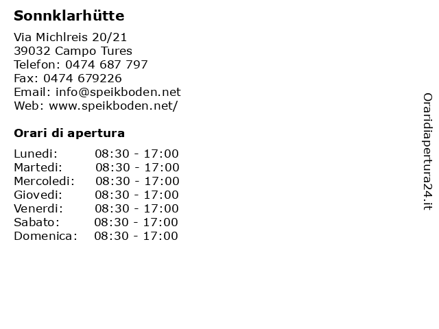 1 Sonnklarhütte Ristorante (distanza: 0,00 km) Via Michlreis 20/21, 39032 Campo Tures bar, bere, mangiare, pizzeria, ristorante, sonnklarhütte, specialità, stuzzicheria 2 Sonnklarhütte Speikboden (distanza: 0,01 km) Via Michelreiser Weg 20, 39032 Campo Tures bar, caffè, dolci, pasticceria, sonnklarhütte, speikboden 3 Sonnklarhütte (Giugno - Ottobre) (distanza: 2,30 km) Speikboden Funivie snc, 39032 Campo Tures (giugno, bar, bere, caffetteria, camere, locale, mangiare, ottobre), ristorante, sonnklarhütte, stuzzicheria 4 Sonnklarhütte Ristorante (Giugno - Ottobre) (distanza: 2,30 km) Speikboden Funivie snc, 39032 Campo Tures (giugno, bar, bere, caffetteria, camere, locale, mangiare, ottobre), ristorante, sonnklarhütte, stuzzicheria 5 Sonnklarhütte Ristorante (Dicembre - Aprile) (distanza: 2,30 km) Speikboden Funivie snc, 39032 Campo Tures (dicembre, aprile), bar, bere, caffetteria, camere, locale, mangiare, ristorante, sonnklarhütte, stuzzicheria 6 Senfter Macelleria (Orario Invernale) (distanza: 34,98 km) Via Mercato Vecchio 4, 39038 San Candido (orario, carne, invernale), macelleria, piatti caldi, salumi, senfter, specialità |