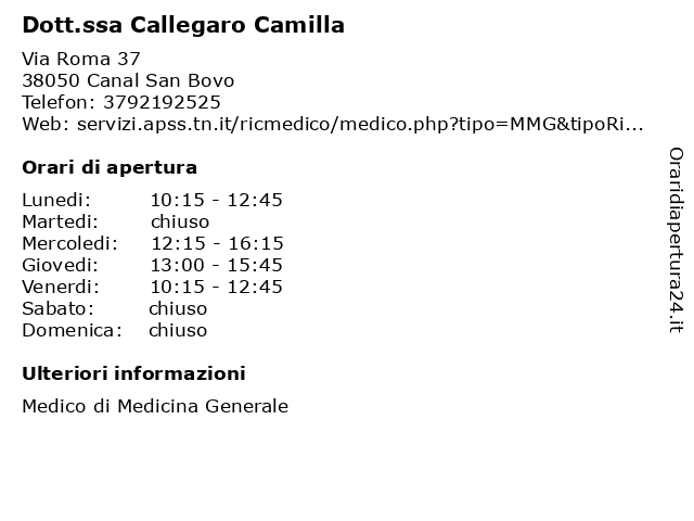 1 Dott.ssa Callegaro Camilla (distanza: 0,14 km) Via Vecchia 11, 38050 Mezzano ambulatorio, callegaro, camilla, dott.ssa, medicina, medico, medico di famiglia, pediatra, sanità, studio medico, visite 2 Dott.ssa Callegaro Camilla (distanza: 4,89 km) Piazza Marconi 12, 38050 Canal San Bovo ambulatorio, callegaro, camilla, dott.ssa, medicina, medico, medico di famiglia, pediatra, sanità, studio medico, visite 3 Dott.ssa Callegaro Camilla (distanza: 5,52 km) Via Roma 37, 38050 Canal San Bovo ambulatorio, callegaro, camilla, dott.ssa, medicina, medico, medico di famiglia, pediatra, sanità, studio medico, visite 4 Dott.ssa Callegaro Camilla (distanza: 5,55 km) Via Pieroi 17, 38050 Canal San Bovo ambulatorio, callegaro, camilla, dott.ssa, medicina, medico, medico di famiglia, pediatra, sanità, studio medico, visite 5 Rigotti Camilla (distanza: 28,88 km) Via Venezia Brigata 12, 38051 Borgo Valsugana camilla, librerie, rigotti 6 Dai Storti (distanza: 31,96 km) Via Foro Boario 6, 31049 Valdobbiadene callegaro, catering, ristoranti, storti, tiziano |