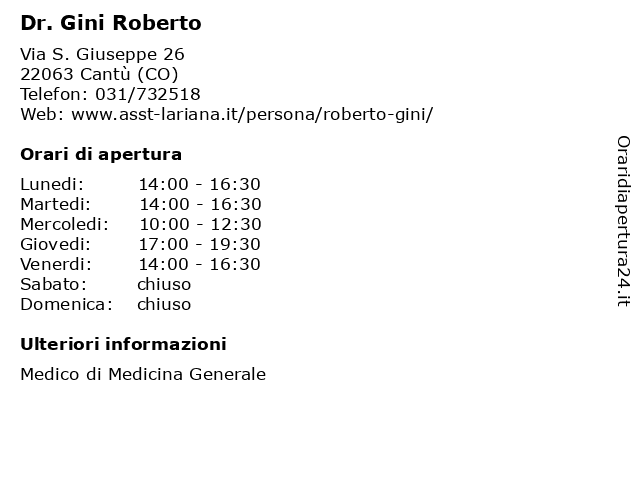 1 Dr. Gini Roberto (distanza: 0,94 km) Via Umbria 11, 22063 Cantù (dr., ambulatorio, ambulatorio comunale, cura, dottore, dottoressa, dr., gini, gini), medico, pazienti, roberto, visite 2 Dr. Gini Roberto (distanza: 1,79 km) Via Alla Chiesa snc, 22063 Cantù (dr., ambulatorio, ambulatorio comunale, cura, dottore, dottoressa, dr., gini, gini), medico, pazienti, roberto, visite 5 Dr. Gini Riccardo (distanza: 10,83 km) Via Manzoni 3, 22079 Villa Guardia ambulatori, analisi, cura della persona, cure, dr., gini, medici, medicina, riccardo, sanità, visite mediche 6 Amici Per La Pelle Snc Di Testa Simona e Gini Alberto (distanza: 11,01 km) Via Guffanti Romolo 2/d, 22070 Bulgarograsso alberto, amici, articoli, comm, dett, gini, pelle, simona, testa, vari |
